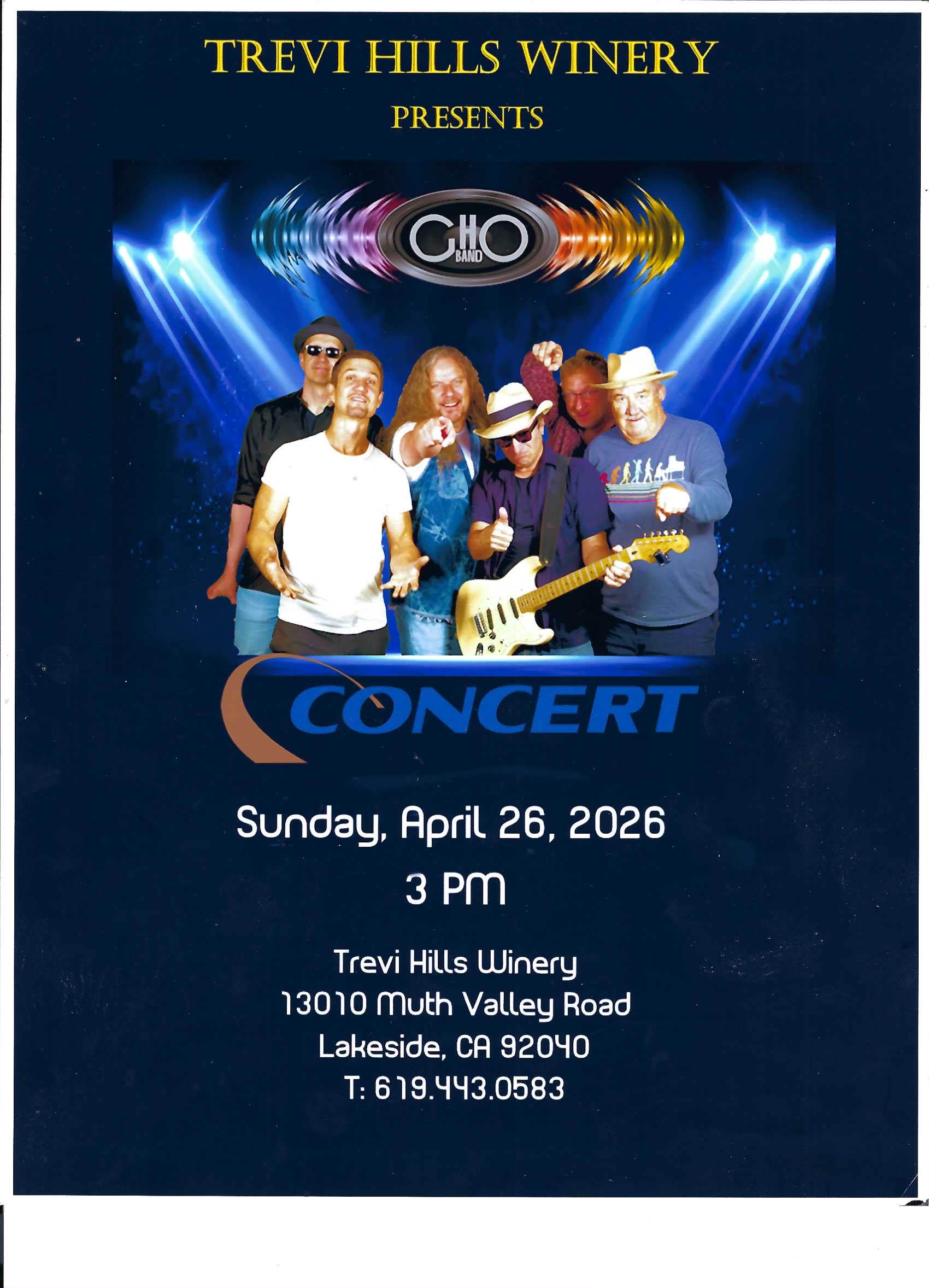Trevi Hills is proud to feature the GHO Band !!!!!!! This six piece band will be rocking the vineyards at Trevi Hills Winery. When Peter and his group get back from tour they head to Trevi to treat us to a mini concert and enjoy some wine!!!!!!!